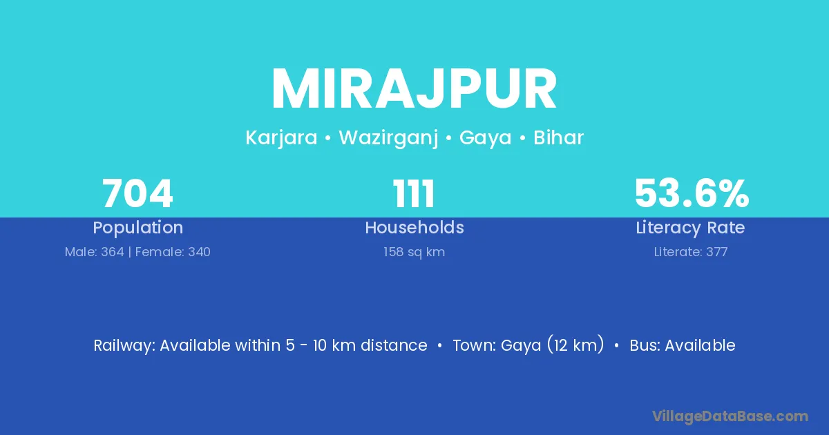 Gaya (12 km) is the nearest town to Mirajpur village for major economic activities and is located approximately 12 km away.