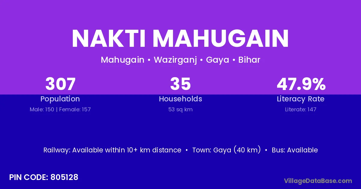 Gaya (40 km) is the nearest town to Nakti Mahugain village for major economic activities and is located approximately 40 km away.