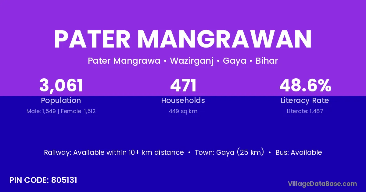 Gaya (25 km) is the nearest town to Pater Mangrawan village for major economic activities and is located approximately 25 km away.