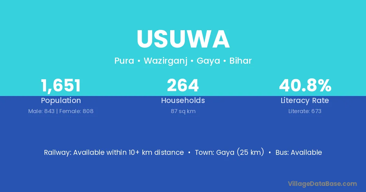 Gaya (25 km) is the nearest town to Usuwa village for major economic activities and is located approximately 25 km away.