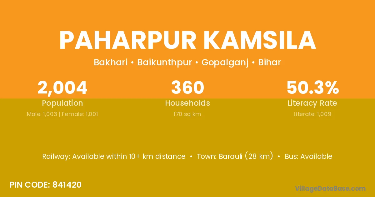 Barauli (28 km) is the nearest town to Paharpur Kamsila village for major economic activities and is located approximately 28 km away.