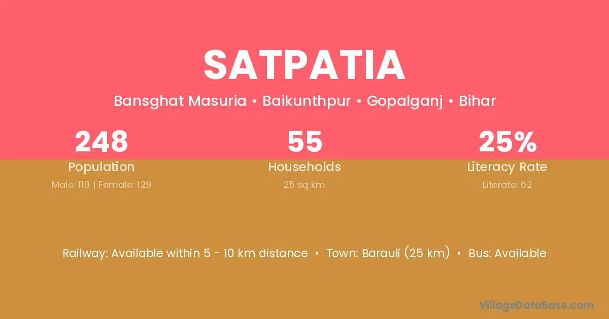 Barauli (25 km) is the nearest town to Satpatia village for major economic activities and is located approximately 25 km away.