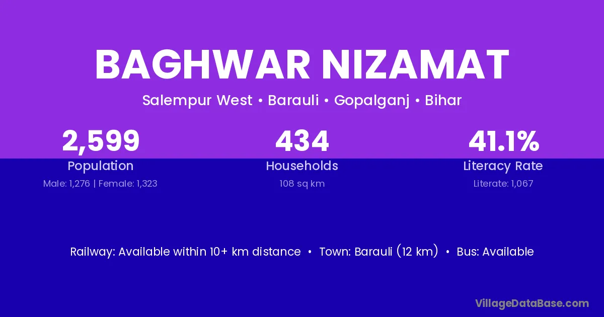 Barauli (12 km) is the nearest town to Baghwar Nizamat village for major economic activities and is located approximately 12 km away.