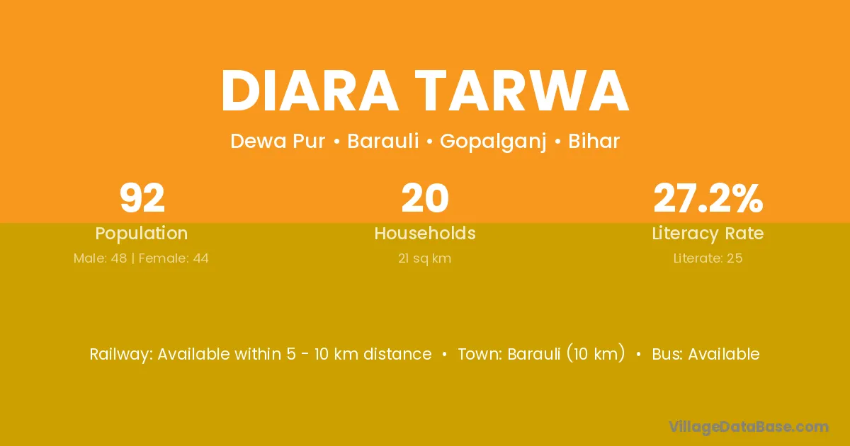 Barauli (10 km) is the nearest town to Diara Tarwa village for major economic activities and is located approximately 10 km away.