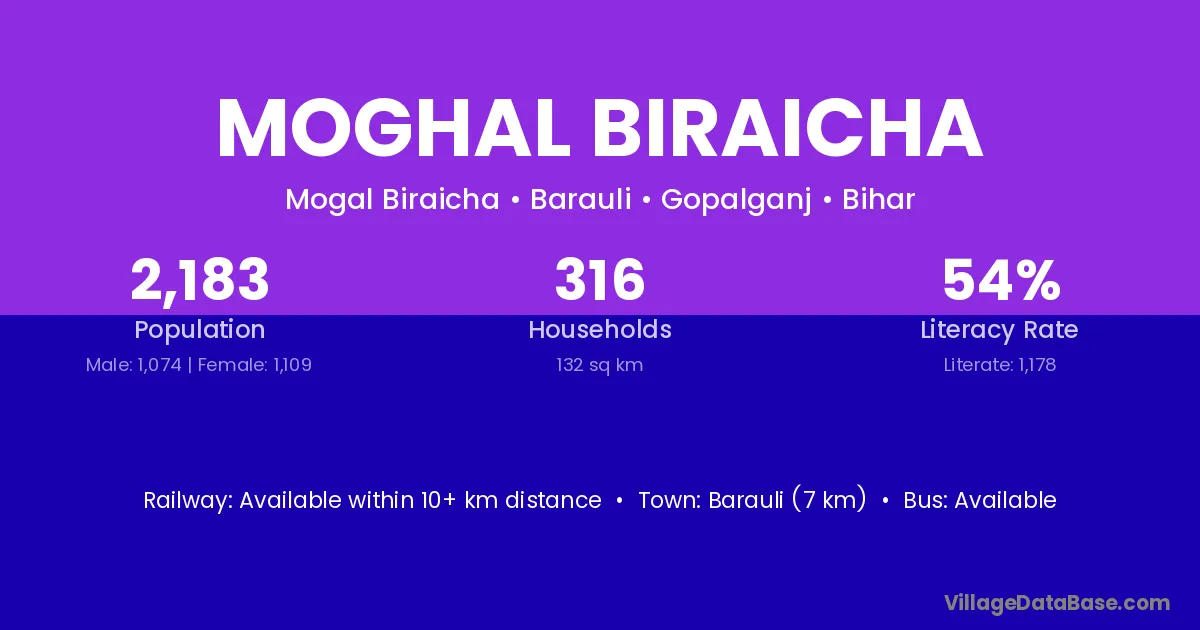 Barauli (7 km) is the nearest town to Moghal Biraicha village for major economic activities and is located approximately 7 km away.