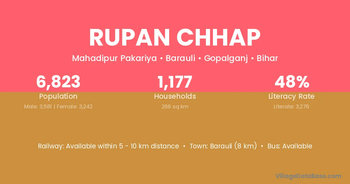 Barauli (8 km) is the nearest town to Rupan Chhap village for major economic activities and is located approximately 8 km away.