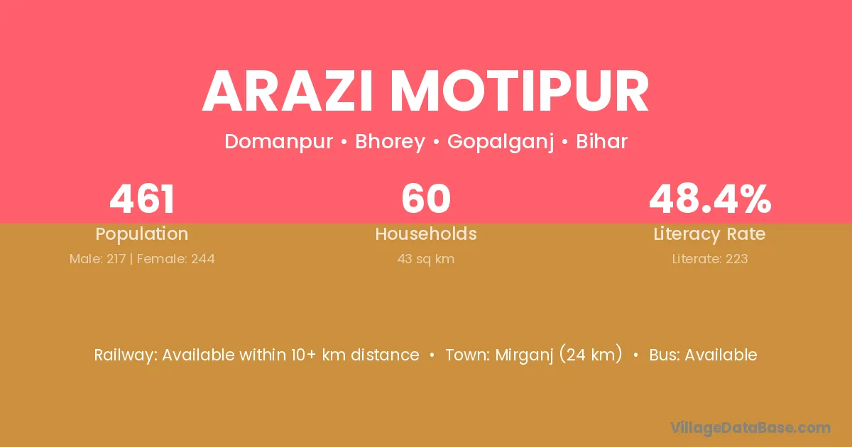 Arazi Motipur village has a total population of 461 people, of which 217 are males and 244 are females.