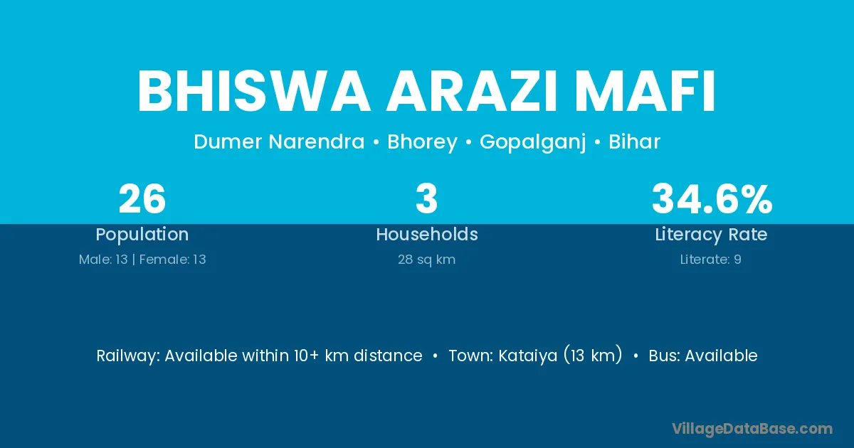 Kataiya (13 km) is the nearest town to Bhiswa Arazi Mafi village for major economic activities and is located approximately 13 km away.