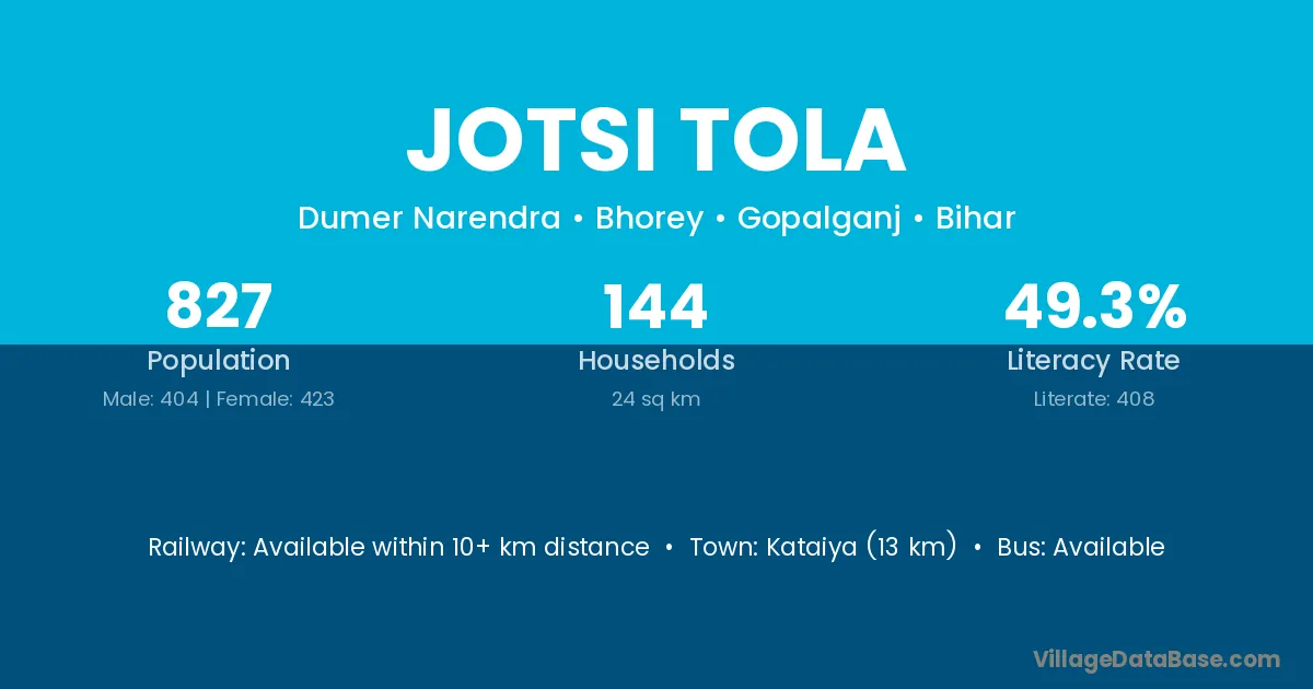 Kataiya (13 km) is the nearest town to Jotsi Tola village for major economic activities and is located approximately 13 km away.
