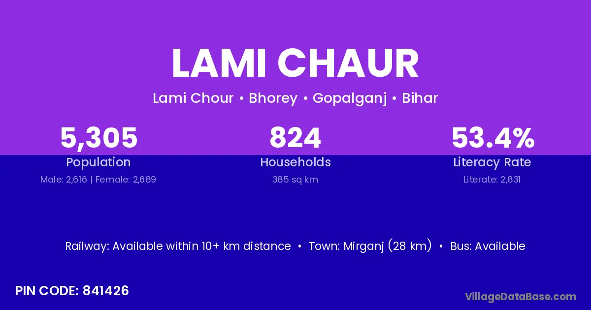 Mirganj (28 km) is the nearest town to Lami Chaur village for major economic activities and is located approximately 28 km away.