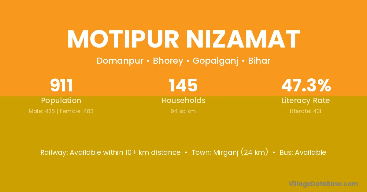 Motipur Nizamat village has a total population of 911 people, of which 428 are males and 483 are females.