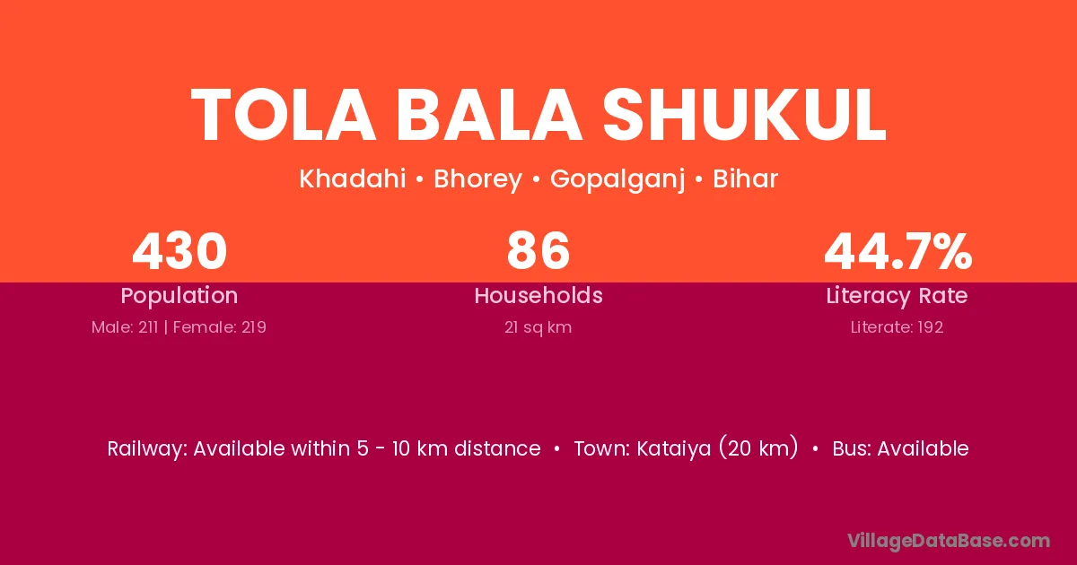 Tola Bala Shukul village has a total population of 430 people, of which 211 are males and 219 are females.