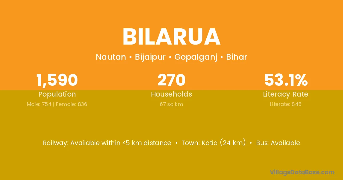 Katia (24 km) is the nearest town to Bilarua village for major economic activities and is located approximately 24 km away.