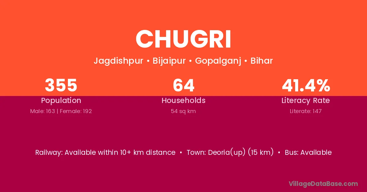 Deoria(up) (15 km) is the nearest town to Chugri village for major economic activities and is located approximately 15 km away.