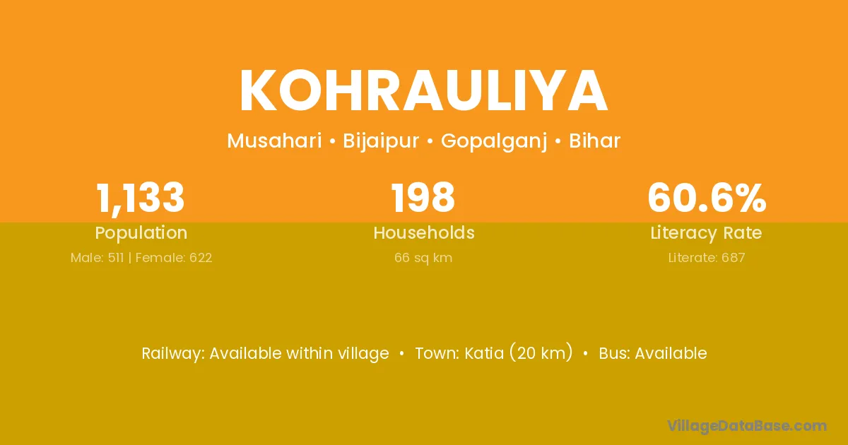 Kohrauliya village has a total population of 1,133 people, of which 511 are males and 622 are females.