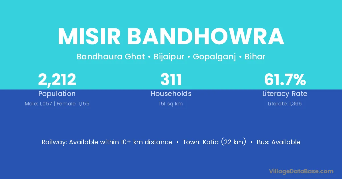Katia (22 km) is the nearest town to Misir Bandhowra village for major economic activities and is located approximately 22 km away.