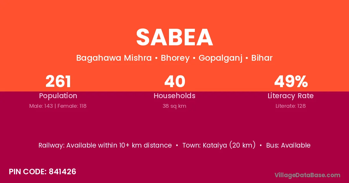 The literacy rate of Sabea village is 53.18%. Male literacy stands at 63.60% and female literacy at 43.78%.