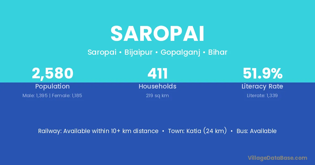 Saropai village has a total population of 2,580 people, of which 1,395 are males and 1,185 are females.