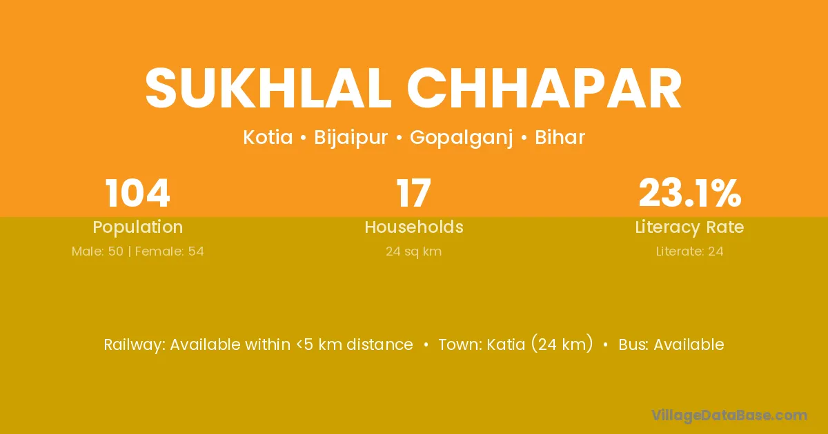 Katia (24 km) is the nearest town to Sukhlal Chhapar village for major economic activities and is located approximately 24 km away.