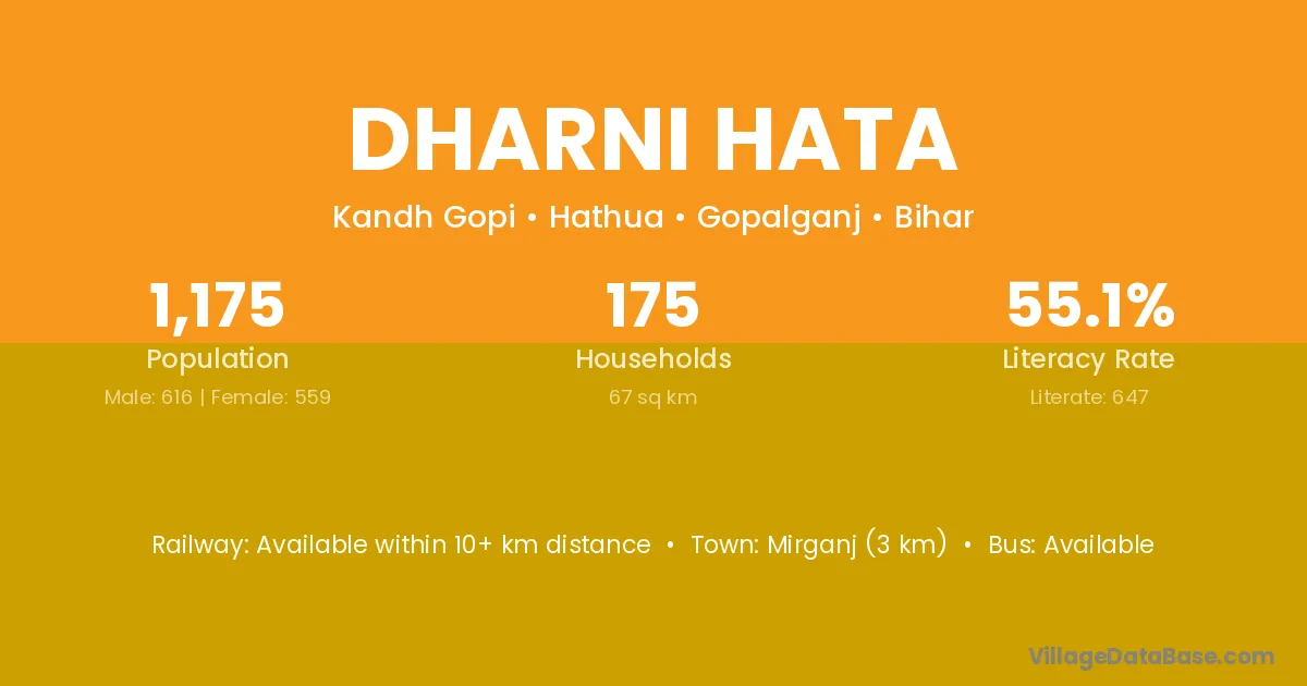 Mirganj (3 km) is the nearest town to Dharni Hata village for major economic activities and is located approximately 3 km away.