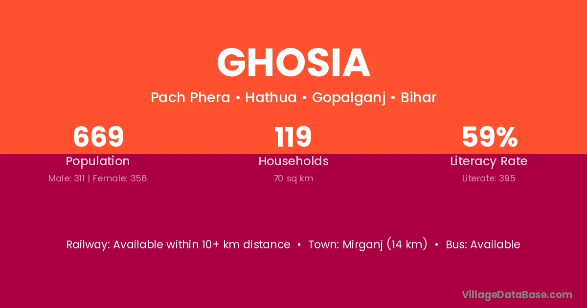 Mirganj (14 km) is the nearest town to Ghosia village for major economic activities and is located approximately 14 km away.
