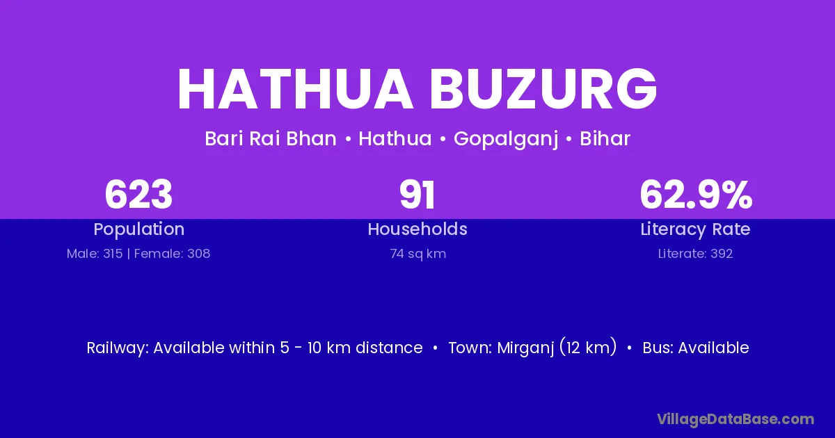 Mirganj (12 km) is the nearest town to Hathua Buzurg village for major economic activities and is located approximately 12 km away.
