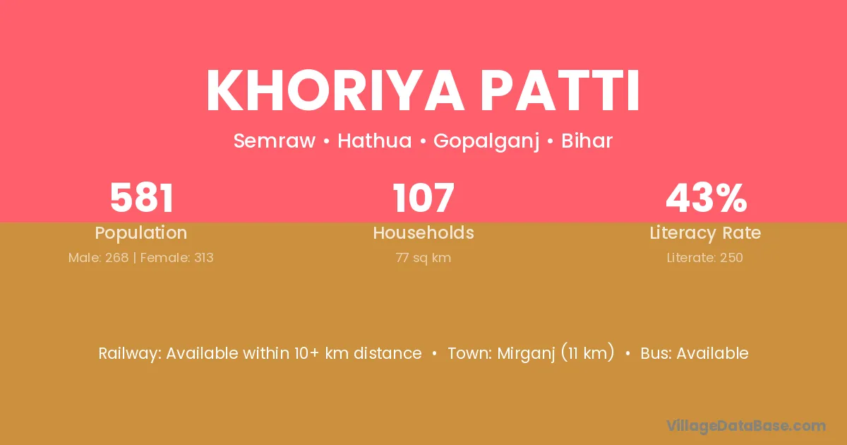 Khoriya Patti village has a total population of 581 people, of which 268 are males and 313 are females.