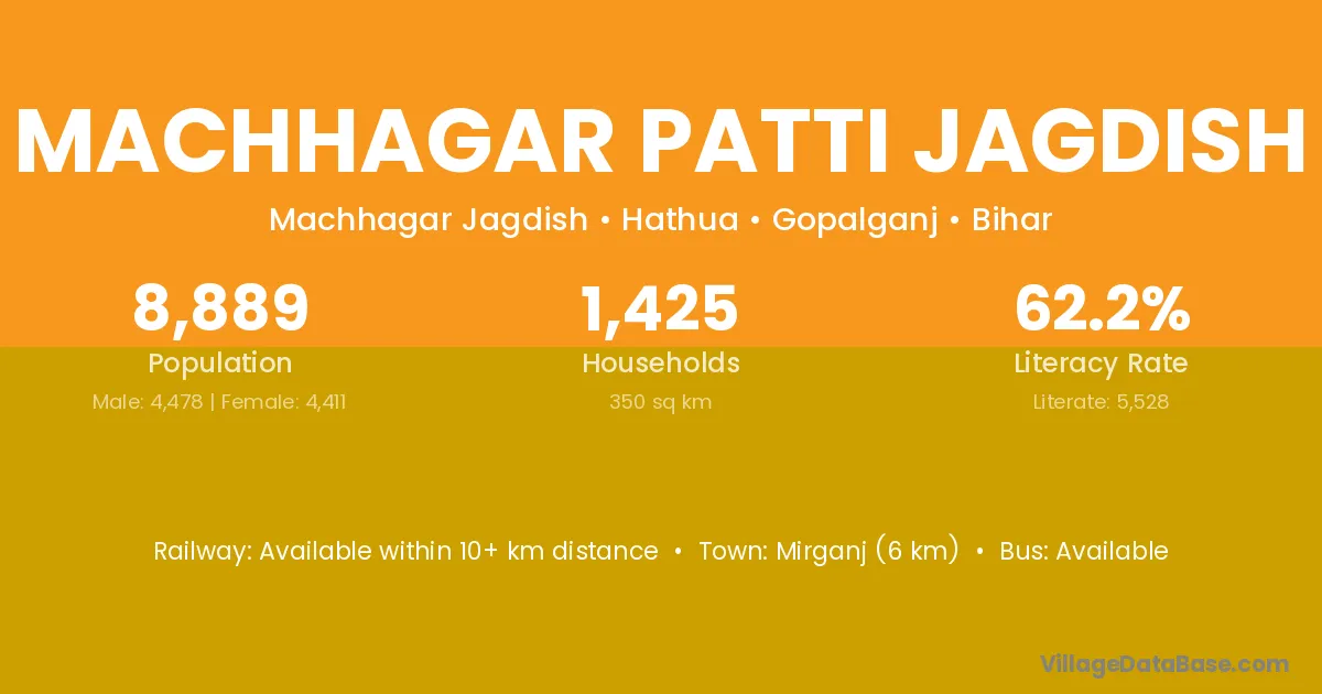 Machhagar Patti Jagdish village has a total population of 8,889 people, of which 4,478 are males and 4,411 are females.