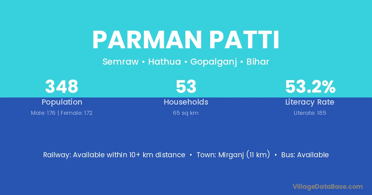 Mirganj (11 km) is the nearest town to Parman Patti village for major economic activities and is located approximately 11 km away.