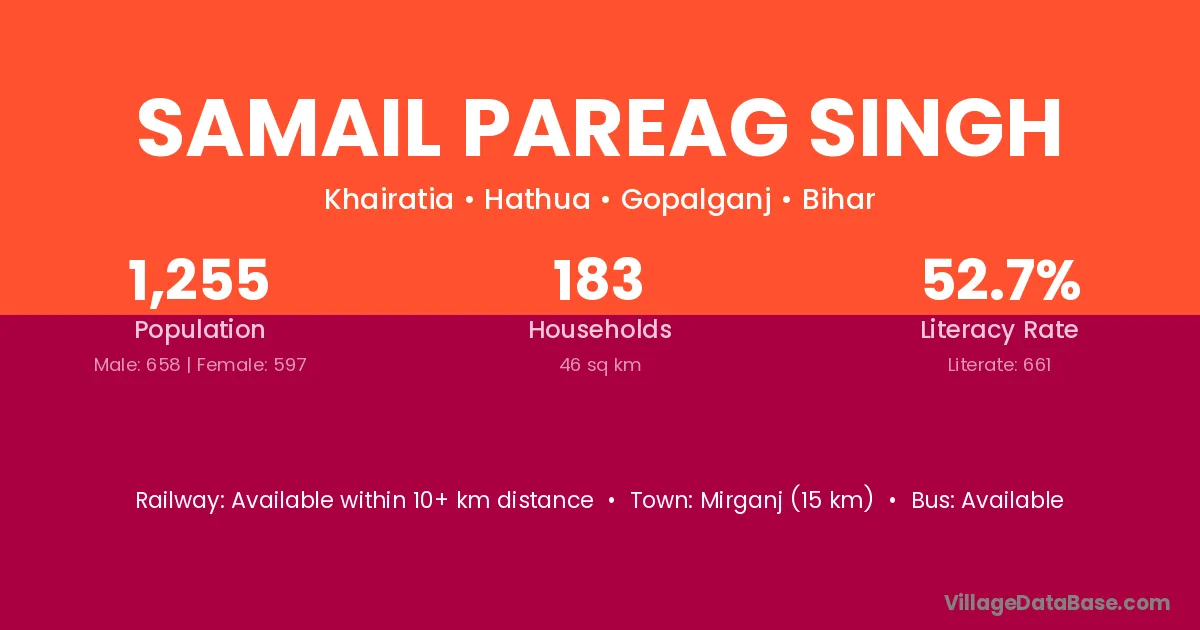 Mirganj (15 km) is the nearest town to Samail Pareag Singh village for major economic activities and is located approximately 15 km away.