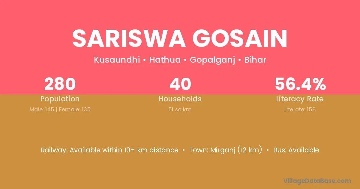 Mirganj (12 km) is the nearest town to Sariswa Gosain village for major economic activities and is located approximately 12 km away.