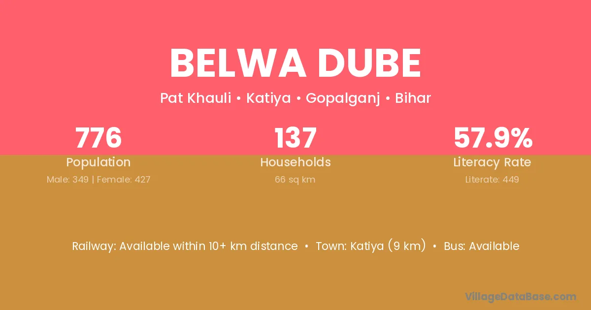 Katiya (9 km) is the nearest town to Belwa Dube village for major economic activities and is located approximately 9 km away.