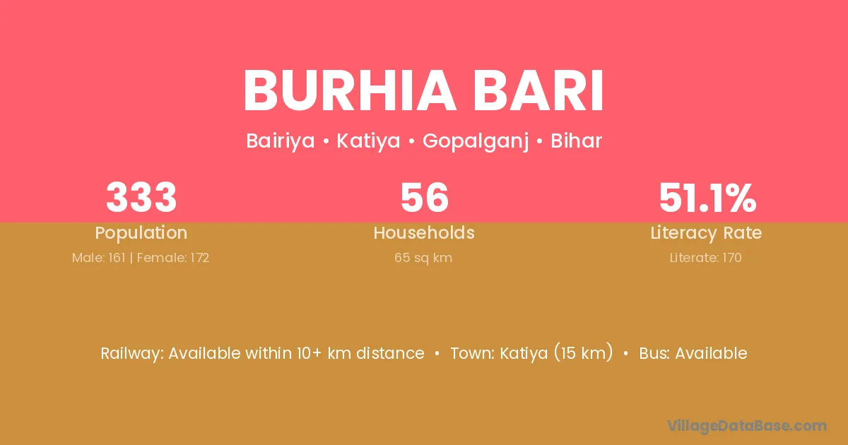 Katiya (15 km) is the nearest town to Burhia Bari village for major economic activities and is located approximately 15 km away.