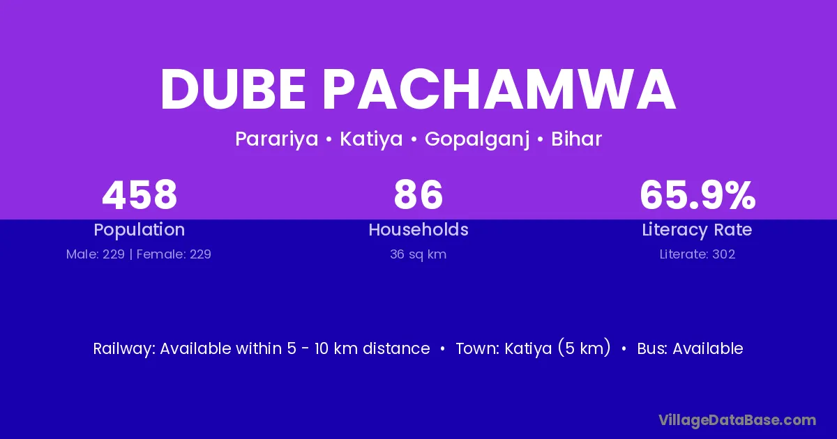Katiya (5 km) is the nearest town to Dube Pachamwa village for major economic activities and is located approximately 5 km away.