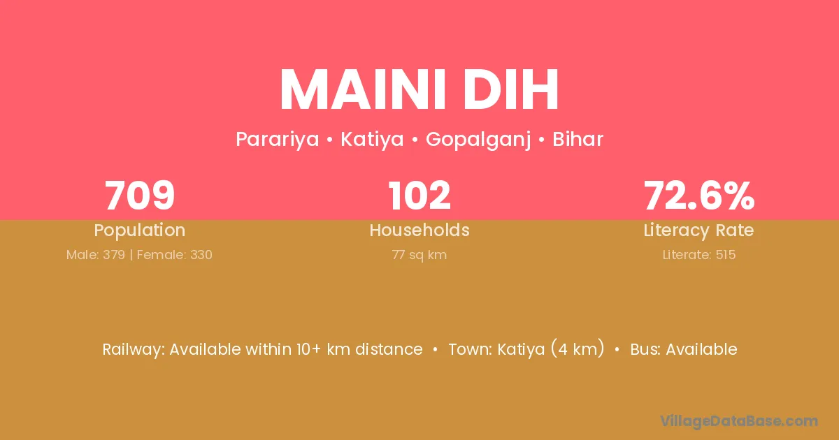 Katiya (4 km) is the nearest town to Maini Dih village for major economic activities and is located approximately 4 km away.