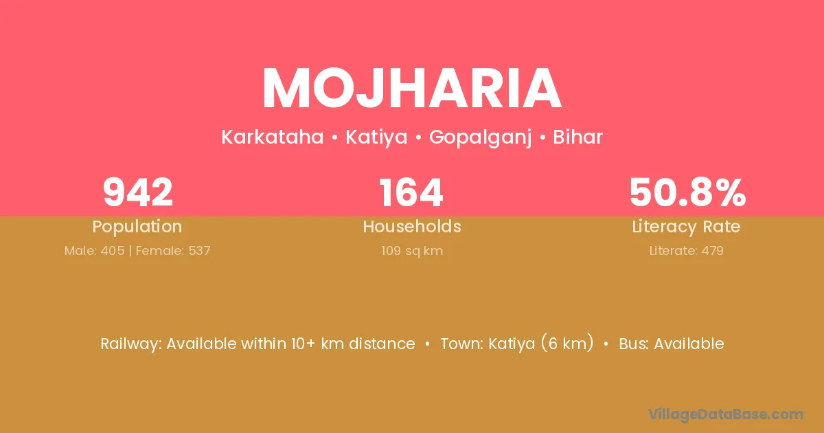 Katiya (6 km) is the nearest town to Mojharia village for major economic activities and is located approximately 6 km away.