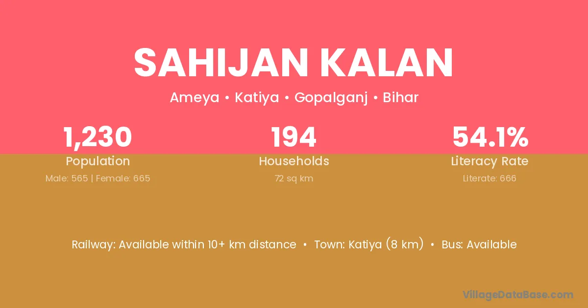 Katiya (8 km) is the nearest town to Sahijan Kalan village for major economic activities and is located approximately 8 km away.