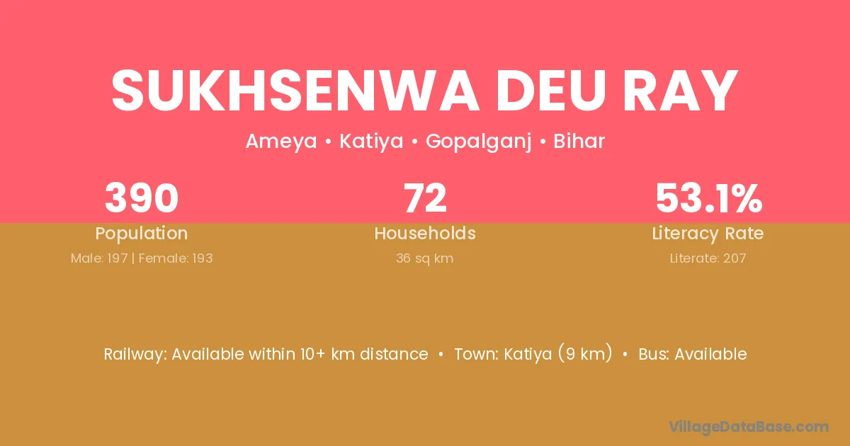Katiya (9 km) is the nearest town to Sukhsenwa Deu Ray village for major economic activities and is located approximately 9 km away.