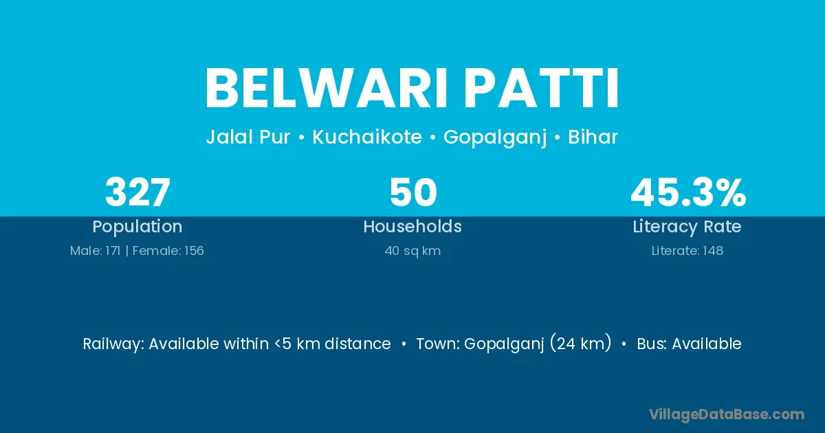 Gopalganj (24 km) is the nearest town to Belwari Patti village for major economic activities and is located approximately 24 km away.