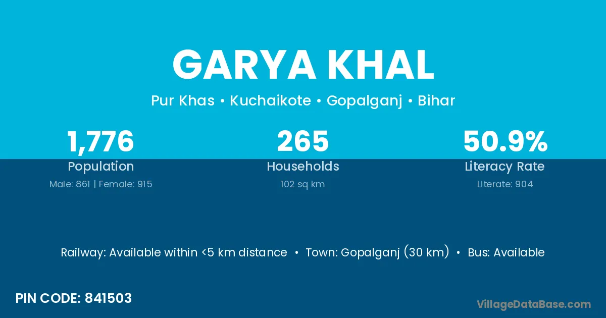 Gopalganj (30 km) is the nearest town to Garya Khal village for major economic activities and is located approximately 30 km away.