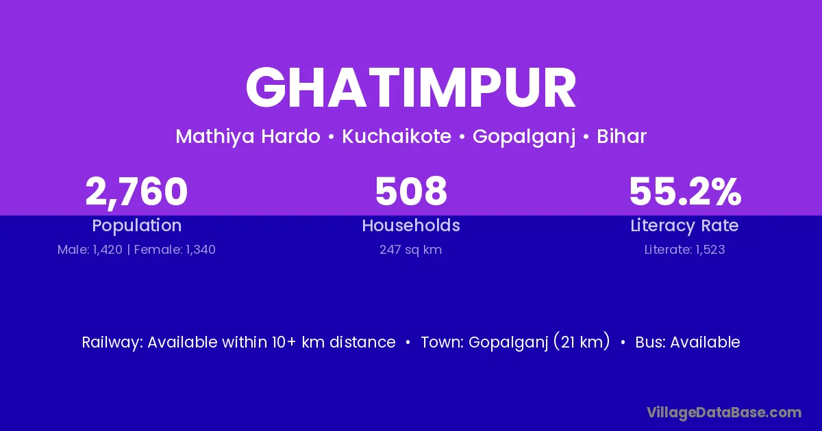 Gopalganj (21 km) is the nearest town to Ghatimpur village for major economic activities and is located approximately 21 km away.