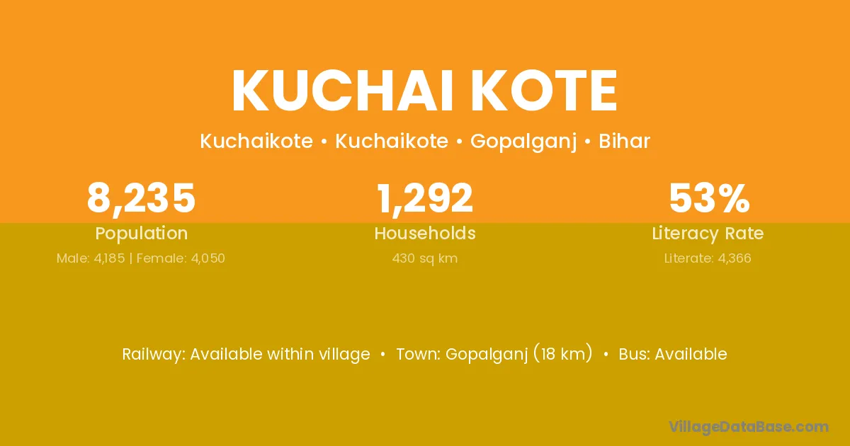 Gopalganj (18 km) is the nearest town to Kuchai Kote village for major economic activities and is located approximately 18 km away.