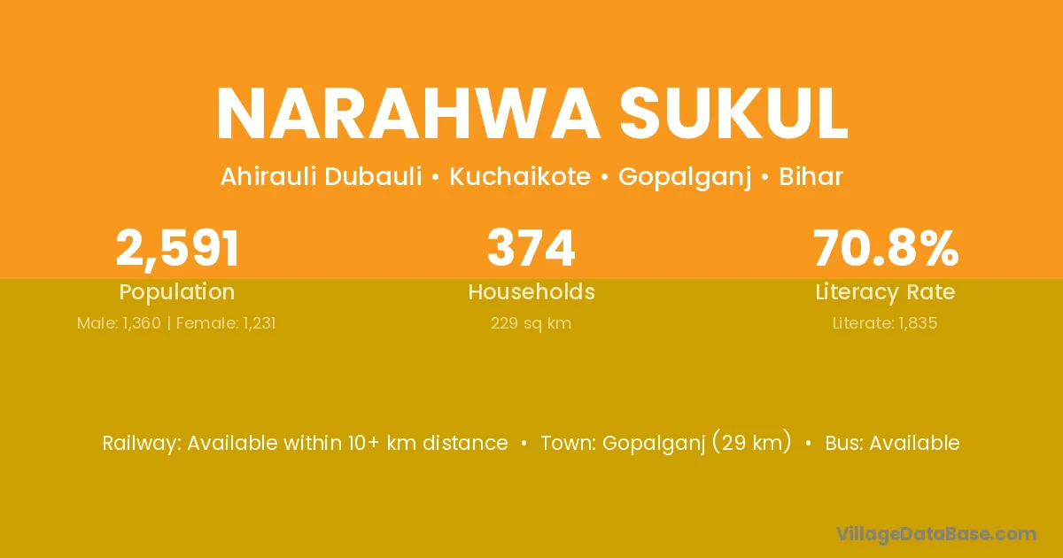 Narahwa Sukul village has a total population of 2,591 people, of which 1,360 are males and 1,231 are females.