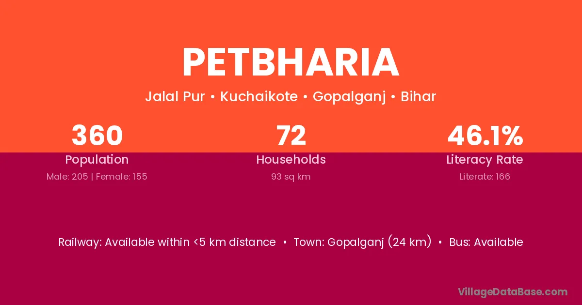 Gopalganj (24 km) is the nearest town to Petbharia village for major economic activities and is located approximately 24 km away.