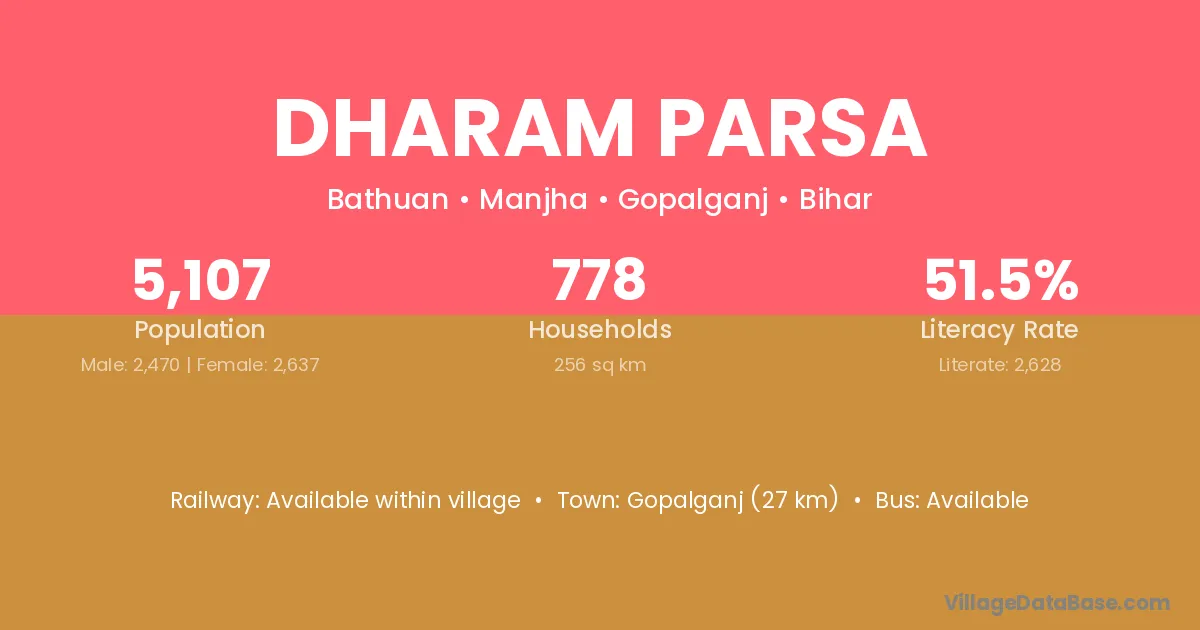 Gopalganj (27 km) is the nearest town to Dharam Parsa village for major economic activities and is located approximately 27 km away.