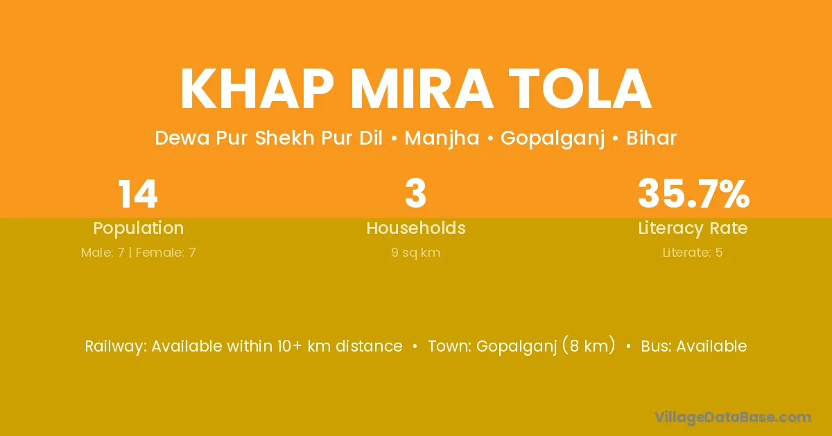 Gopalganj (8 km) is the nearest town to Khap Mira Tola village for major economic activities and is located approximately 8 km away.