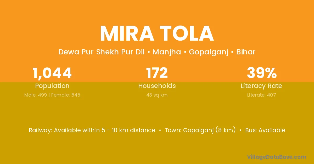 Gopalganj (8 km) is the nearest town to Mira Tola village for major economic activities and is located approximately 8 km away.