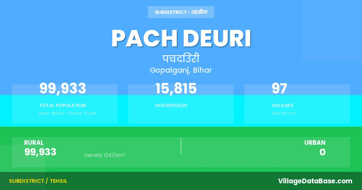 Pach Deuri is a town and Subdivision in the Gopalganj district of the Bihar. In India, a Subdivision is a subdivision of a district responsible for the administration and revenue collection of a specific area within the district. Subdivisions play a crucial role in the local governance structure, contributing significantly to the development and administration of their communities.