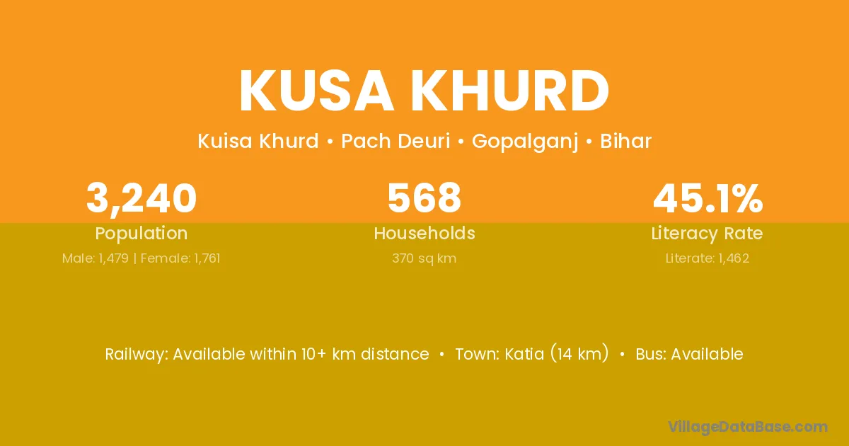 Katia (14 km) is the nearest town to Kusa Khurd village for major economic activities and is located approximately 14 km away.