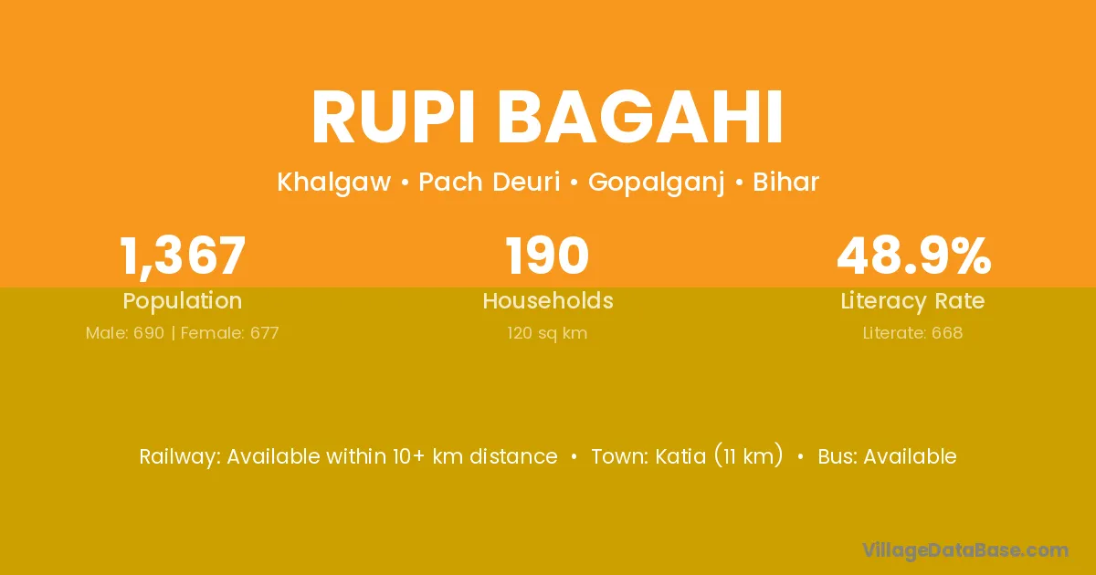 The literacy rate of Rupi Bagahi village is 48.87%. Male literacy stands at 58.26% and female literacy at 39.29%.